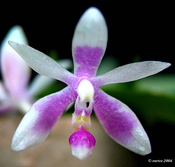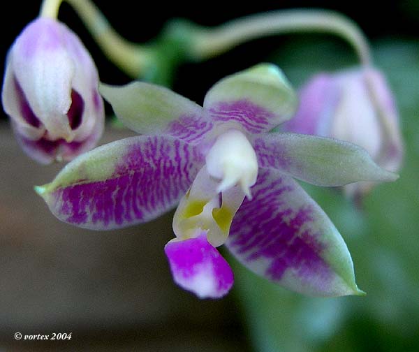 Found in Borneo in lower stature hill and lower montane forests low down or on the base and roots of trees near streams at elevations around 50 to 900 meters as a small sized, hot to warm growing epiphyte with a short stem enveloped completely by several leaf-bearing sheaths and carrying a few, distichous, fleshy, obovate to obovate-lanceolate, acute, gradually narrowing below into the subpetiolate base leaves that blooms in the spring and in the fall on a slender, arching to pendant, 5 to 6" [12.5 to 15 cm] long, racemose or occasionally sparsly branched, few to many flowered inflorescence that is shorter than the leaf with distichous, ovate-lanceolate, cucullate floral bracts and carry somewhat delicate, strongly fragrant honeysuckle, grape, lilac and candy scented flowers.
