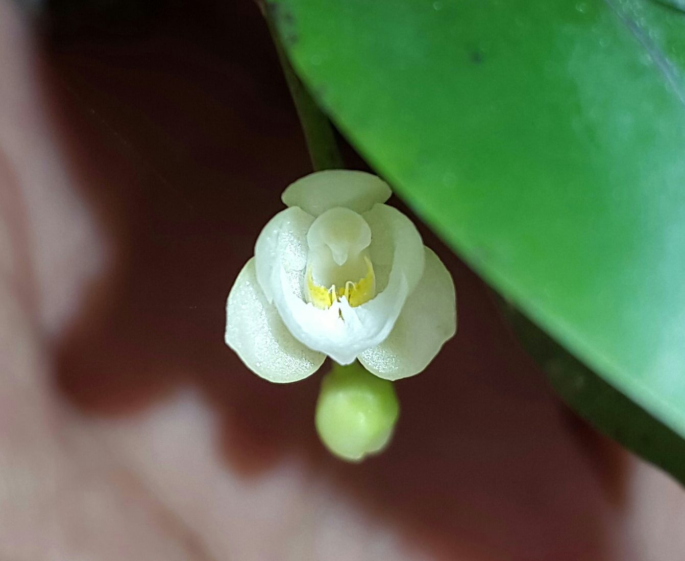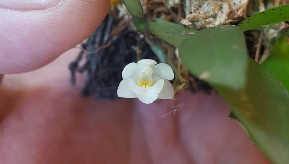 Found in southern India at elevations of 750 to 1800 meters as a mini-miniature sized, warm to cool growing epiphyte with a very short stem carrying 1 to 3, possibly deciduous, oblong-elliptic, conduplicate at the subpetiolate base leaf that blooms in the fall on a terete, short, between the leaves, .4 to 3.2" [1 to 8 cm] long, purplish violet, few flowered inflorescence with lanceolate, acute floral bracts