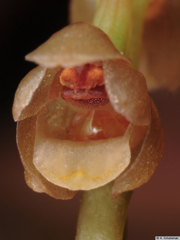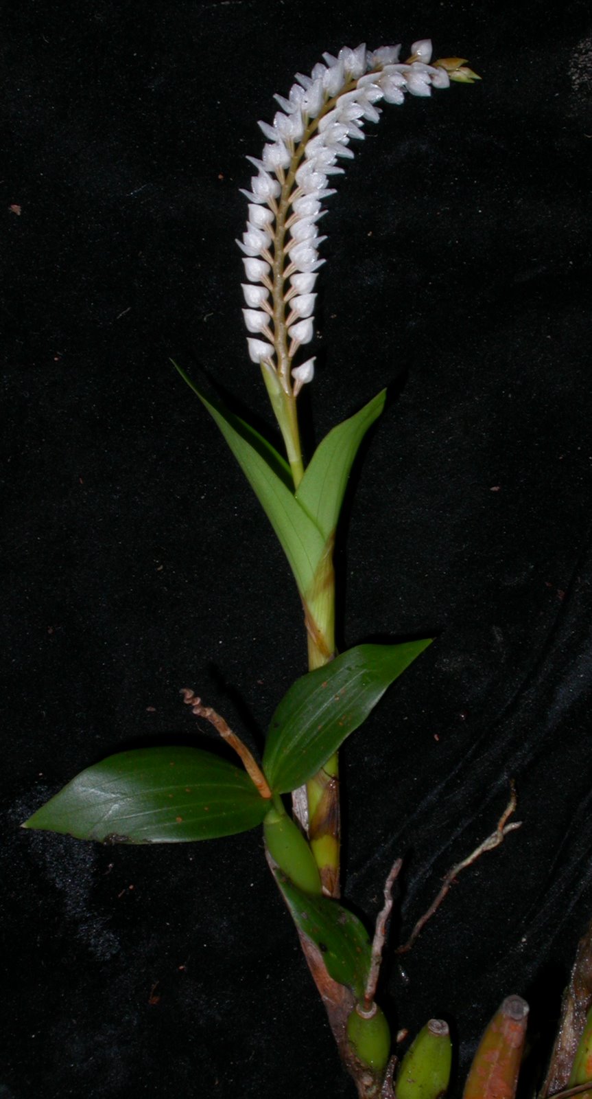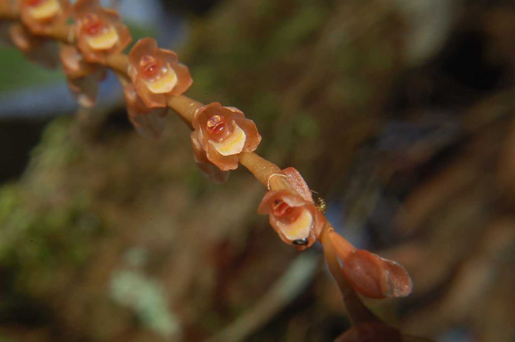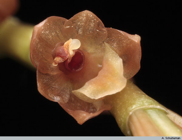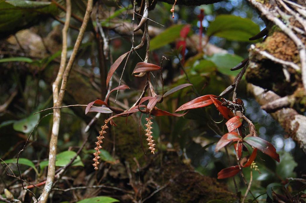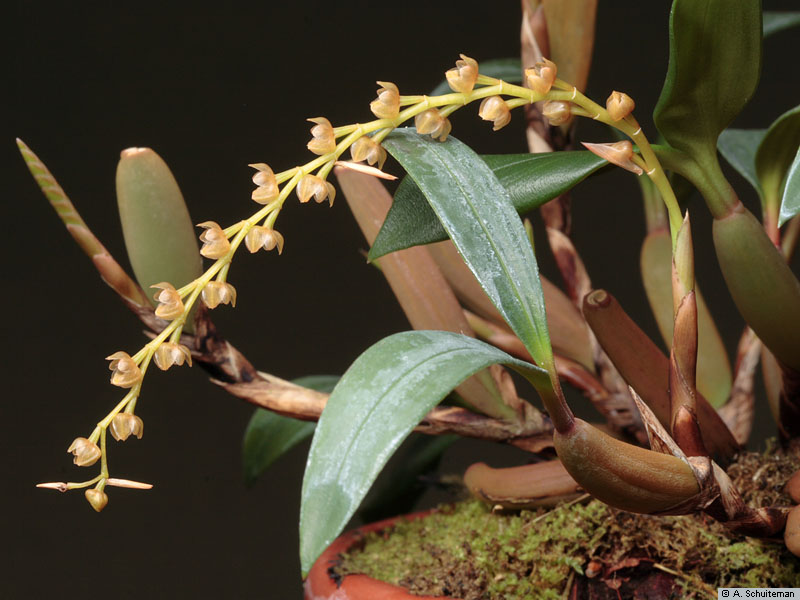 Found in Thailand, Malaysia, Borneo, Java, Sumatra, Sulawesi, Lesser Sunda Islands, Moloccas, Bismark Islands, New Guinea and the Philippines in lower montane forests oak/laurel and moss forests at elevations of 900 to 2100 meters as a small sized, warm to cold growing epiphyte with a creeping, climbing, hanging, freely branching rhizome enveloped by large, brown sheaths and carrying close set, to 1.2" [3 cm] between each, oblong to oval, setting at an acute angle on the rhizome, reddish to brown pseudobulbs carrying 2, apical, narrowly lanceolate, acute, 3 veined, basally petiolate leaves that blooms in the spring on a to 6.2" [16 cm] long, fractiflex, arching inflorescence arising from the apex of newly developing pseudobulbs with oval, acute floral bracts that fall off early on and carrying several flowers that are alternately opposite on the rachis.