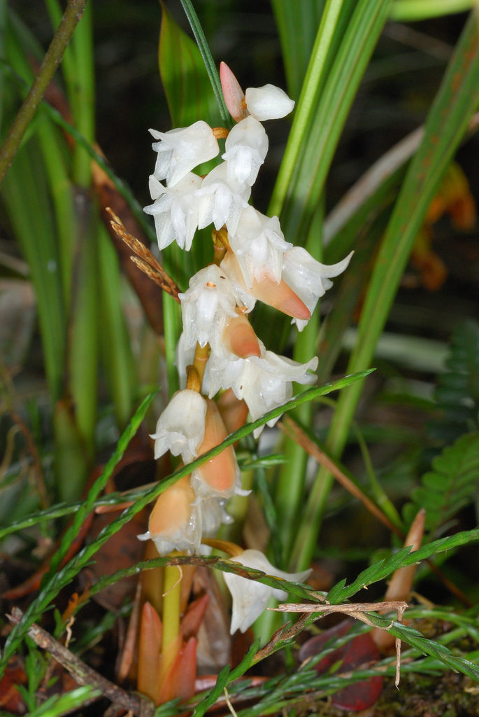 Found in Borneo in mossy lower montane and mossy forests at elevations around 800 to 3400 meters as a small to just medium sized, warm to cold growing epiphyte or terrestrial with slender, somewhat fusiform pseudobulbs carrying a single, apical, narrowly elliptic to linear-elliptic, acute, plicate, 5 to 7 nerved leaf that blooms in the fall through summer on a proteranthous, 18 to 25 flowered, 6" [15 cm] long, erect infloresence with ligulate, obtuse to acute, stiffly herbaceous, cauducus, many nerved, salmon-pink floral bracts.