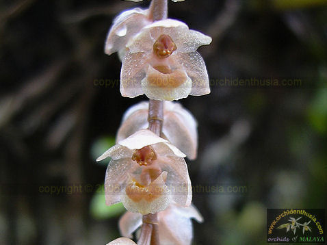 Found in penninsular Malaysia in the Cameron Highlands in montane forests at elevations around 1500 to 1800 meters as a small sized, cool growing epiphyte with .4 to .8" [1 to 2 cm] between each smooth, angled, tapering towards the apex, widest at the base pseudobulbs carrying a single, apical, wider in the upper half, shortly acuminate, plicate, petiolate base leaf that blooms in the fall on a synanthous, thin becoming thicker in the rachis, flexuous, nodding to pendulous, 6 to 8" [15 to 20 cm] long, many flowered inflorescence with deciduous, elliptic, apically rounded bracts