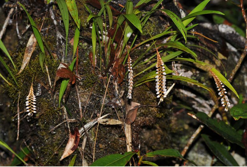 Found in Borneo in lower montane forests at elevations of 1600 to 2400 meters as a small to medium sized, cool to cold growing epiphyte or terrestrial with an erect to ascending, more or less angular, more or less swollen pseudoblulbs enveloped by persistent, sheaths becoming fibrous with age and carrying a single, apical, narrowly linear, acute to rounded, plicate, 5 to 9 main nerved, petiolate below into the base leaf that blooms in the fall and winter on a synanthous, wiry, somewhat angular, pendulous, 4.6 to 13.6" [11.5 to 34 cm] long, 9 to 40 flowered inflorescence with 1 to 3, sterile bracts and persistent, patent, lateral margins incurved, ovate to broadly ovate, acute to obtuse, hairy, membraneous, floral bracts