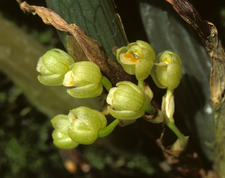 Found in Assam, the eastern Himalyas, Nepal, the Chinese Himalayas, and Myanmar at elevations around 1500 to 2400 meters as a small to large sized, cool to cold growing epiphyte with an elongate, slender stem giving rise to at intervals, fusiform pseudobulbs often bracteate at the base and carrying 2, apical, membraneous, narrowly elliptic, acute, narrowing below into the petiolate base leaves that blooms in the fall on several, from joints on the rhizome, shorter than the leaves, 2 to 4" [5 to 10 cm] long, few flowered inflorescence
