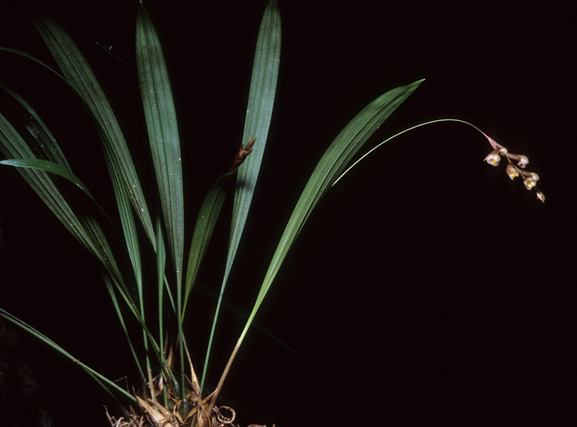 Found in Sarawak, Brunei and Sabah Borneo in ridge top forests at elevations of 1300 to 1700 meters as a miniature to small sized, cool growing epiphyte with ascending, slender, longitudinally wrinkled pseudobulbs hidden by the persistent, basal scales and fibers and carrying a single, apical, linear, widest above the middle, acute, mainly 5 nerved, petiolate base leaf that blooms in the later fall on an erect, synanthous, peduncle wiry, terete to somewhat angular, 2.8" to 5.6" [7 to 14 cm] long, rachis pendulous, distinctly zig-zag, .8 to 1.08" [2 to 2.7 cm] long, 5 to 8 flowered inflorescence carrying non-resupinate flowers.