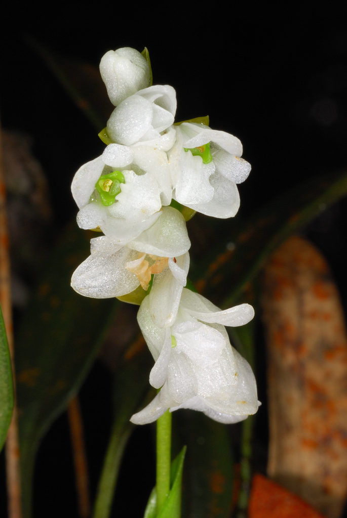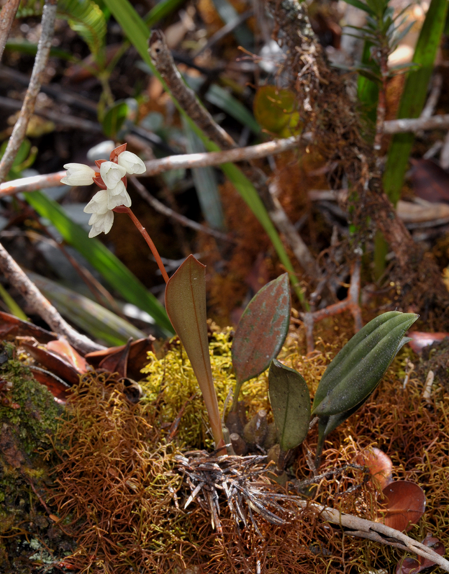 Found in Borneo in upper montane forests in thick moss on small branches of bushes or as a terrestrial at elevations around 1200 to 3500 meters as a small sized, cool to cold growing epiphyte or rarely terrestrial with crowded, narrowly cylindrical to narrowly ovate, yellowish-green pseudobubls carrying a single, apical narrowly-elliptic to linear, acute, tough, thickly coriaceous, olive-green stained red, sulcate, conduplicate below into the elongate, petiolate base leaf that blooms at most any time of the year on a laxly 5 to 9 flowered, 6" [15 cm] long, gradually lengthening, straight, stiff, elliptic in cross-section inflorescence that emerge terminally with the half grown new growth with ovate, acute, acuminate floral bracts and carrying flowers that all turn in one direction.