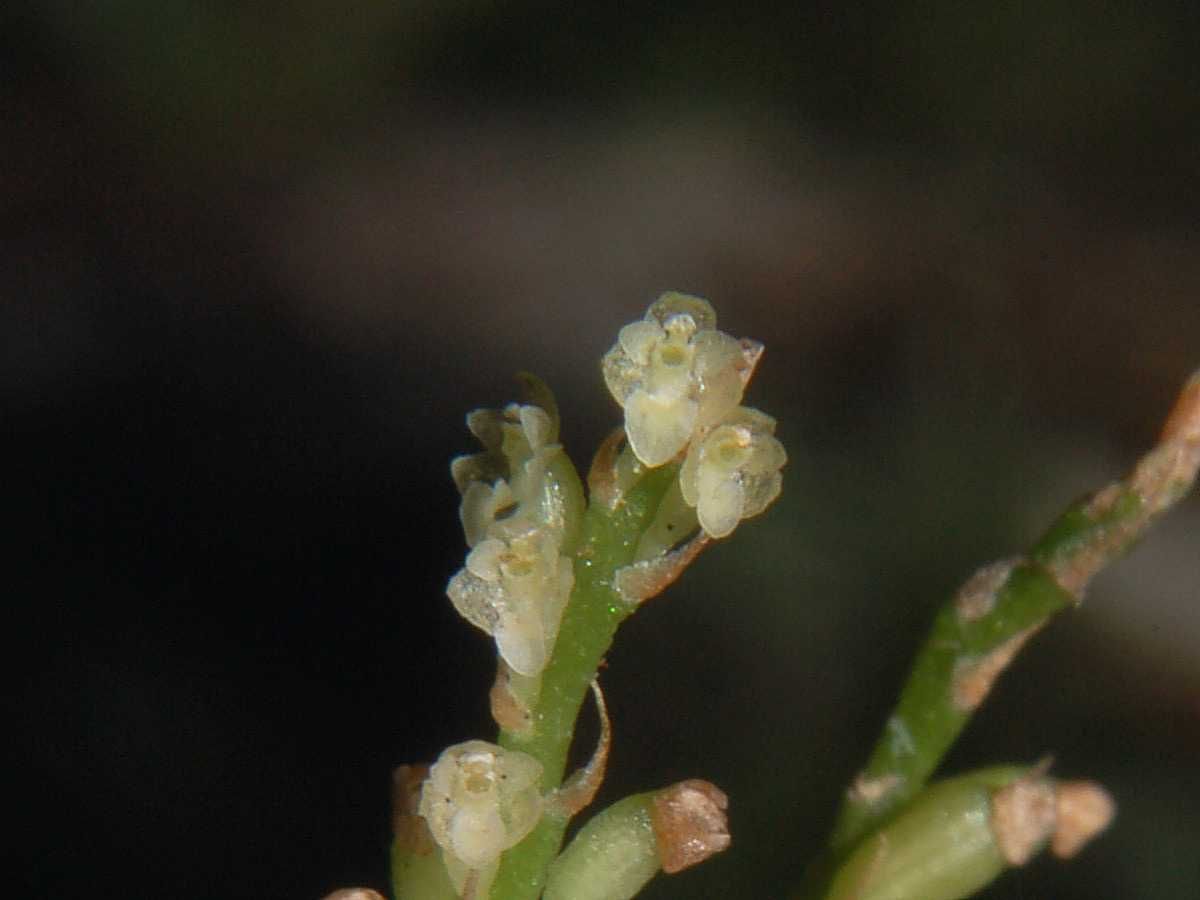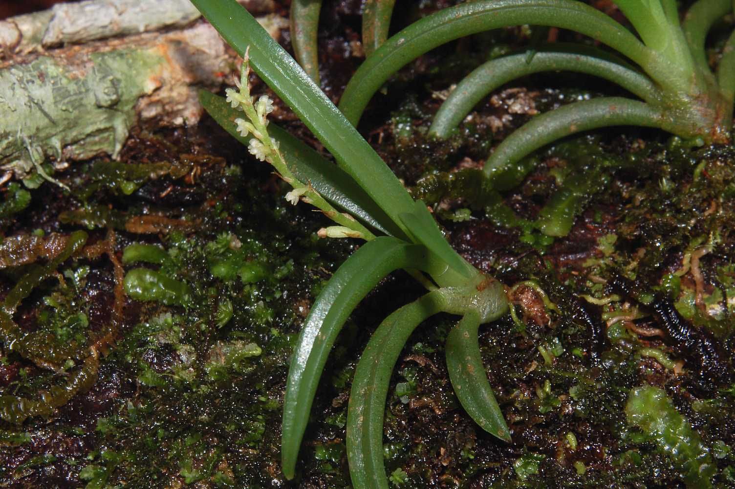 Found in penninsular Malaysia in mossy upper montane forests in exposed locations as a miniature sized, cool growing epiphyte with no pseudobulbs and a fan of conduplicate, fleshy, thick, strap shaped, curved, acute leaves that blooms on an axillary, .8" [2 cm] long, several flowered, racemose inflorescence
