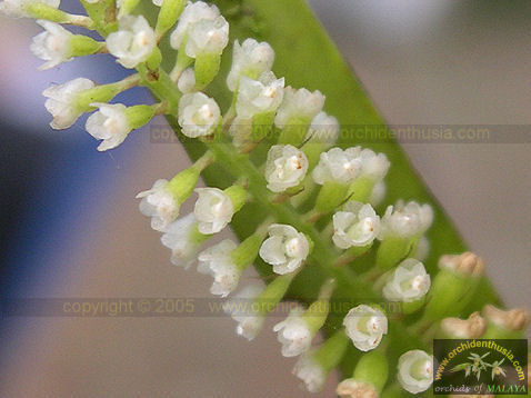 Found in Malaysia, Java and Sumatra as a mini-miniature sized, warm to cool growing epiphyte with a very short stem carrying to 8 to 9, close-set, two ranked, linear, unevenly bilobed apically, light green above, with paler blotches beneath leaves that blooms on an axillary, [7 to 11 cm] long, angular, densely many flowered inflorescence with lanceolate below and threadlike apically floral bracts.