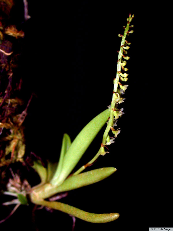 Found in Andaman Islands, Thailand, Vietnam, Laos, Borneo, Java, Malaya, Moluccas, the Philippines, Sulaewsi and Sumatra in lowland swamp forests and on limestone hills at elevations of 600 to 2000 meters as a miniature sized, warm to cool growing epiphyte with 5 to 9, arranged in a loose fan-shape, almost terete, v-channeled above, acute leaves that blooms in the fall on a .8" [2 cm] long, many flowered inflorescence