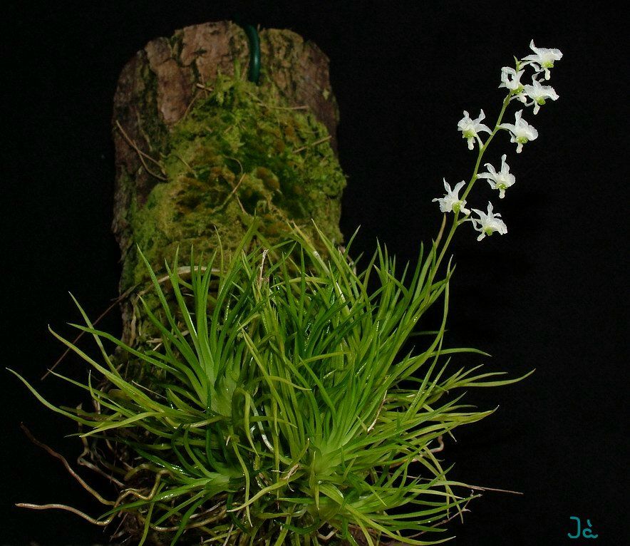 This is a dwarf epiphyte that is found in Brazil that appears to be a Tillandsia with a short stem carrying spirally arranged, linear-aciculate, delicate light green, pin-like, acute, recurved, bilateally flattened leaves held in a tuft, that blooms on a erect, short, laxly 3 to 10 flowered, slender inflorescence occuring in the summer with linear bracts that is a bit longer than the leaves and needs deep shade, high humidity and year round water and fertilizer.