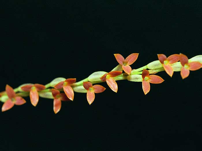 Found in Mexico, Guatemala, El Salvador and Nicaragua on oaks in wet or dry forests at elevations of 1800 up to 3500 meters as a small sized, cool to cold growing epiphytc species with erect or ascending, clustered, terete pseudobulbs subtended by scarious, tubular sheaths and carrying a single, apical, suberect ot erect, elliptic-oblanceolate, fleshy, obtuse and minutely retuse apically, gradually narrows below into the elongate conduplicate, petiolate base leaf and blooms mostly in the summer on a terminal, arcuate, simple, longer than the leaf, 3 to 14" [7 to 35 cm] long, laxly many [100] flowered inflorescence that has scarious, tubular spathaceous bracts and simultaneously opening flowers.