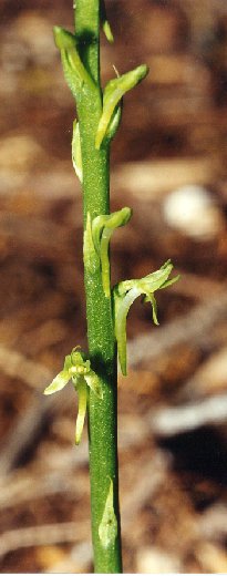 Found in British Columbia, Washington, Oregon, California and Idaho along road cuts, in dry chaparral, in mixed evergreen and oak forests as a medium to large sized, cold growing terrestrial with a pair of ovaois, bienial tuberoids giving rise to 3 to 5, basal, fugacious, oblong-elliptic to oblanceolate, becoming bract-like above leaves that fade before blooming occuring in the later spring and summer on an erect, terminal, spicate, narrow, loosely to densely, several flowered inflorescence with lanceolate, somewhat shorter than the ovary floral bracts and carrying whitish flowers.