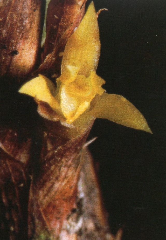 Found in Ecuador at elevations of 850 to 2300 meters as a medium sized, warm to cold growing epiphyte with a descending, branching, slender stem enveloped completely by close, distichous, imbricate, scarious sheaths with .8 to 1.6" [2 to 4 cm] between each pyriform pseudobulbs and carrying 1 to 2, apical, filiform, channeled, acute leaves that blooms on a sessile, from the scarious sheaths, single flowered inflorescence.