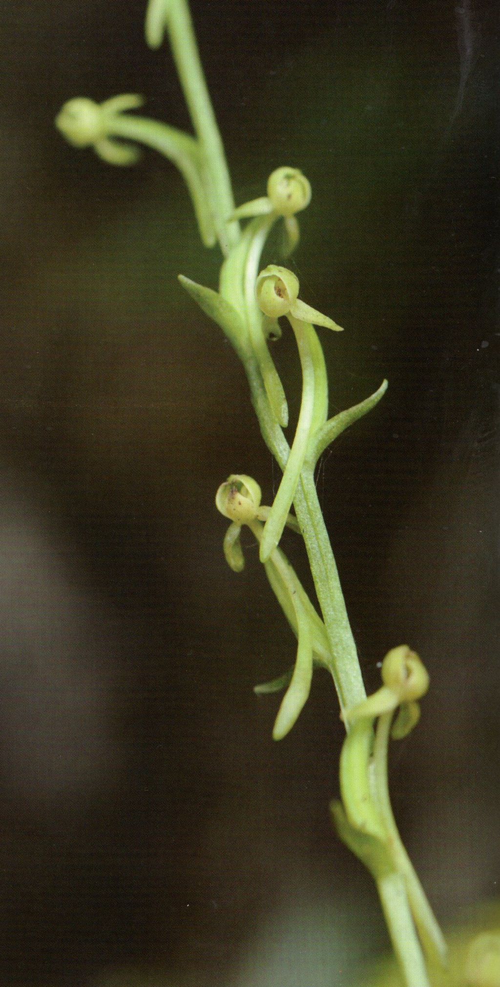 Found in Hunan province of China in broad-leaved forests at elevations of 800 to 1500 meters as a small to medium sized, warm to cool growing terrestrial with a fusiform tuber giving rise to an erect stem provided with 1 to 2, cylindrical sheaths and carrying 3 to 5, linear-lanceolate, small towards the apex, acute leaves that blooms in the later spring on an erect, 4.6 to 9.2" [11.5 to 23.5 cm] long, laxly 13 to 30 flowered inflorescence