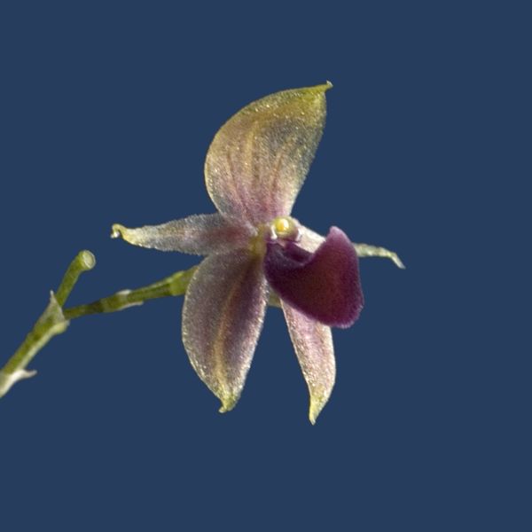 Found in Imbabura department of Ecuador at elevations around 1500 meters as a mini-miniature sized, cool growing, densely caespitose, epiphyte with terete, short, ramicaul enveloped by 2 to three ribbed, imbricating sheaths and carrying a single, erect, coriaceous, roundish, retuse apically with an apiculus nestled within the leaf, petiolate-spathulate below into the base leaf that blooms in the later spring on a horizontal to descending, cylindrical, flexuous, distichous, peduncle slender, .2 to .4" [.5 to 1 cm] long, rachis to 1" [2.5 cm] long, successively several, single flowered inflorescence with thin, acute, conduplicate floral bracts.