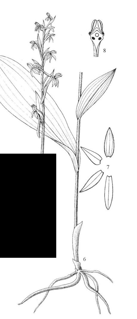 Found in Tibet (Zayü) to China in western Sichuan and northwestern Yunnan in forests and grasslands on slopes and slong gullies at elevations of 2500 to 3300 meters as a miniature to small sized, cold growing terrestrial with an erect to ascending, slightly stout, stem with 1 to 2 tubular, basal sheaths and carrying cauline, oblong-elliptic, basally clasping, acute leaves that blooms in the later summer on an erect, .8 to 4" [2 to 10 cm] long, to 10 flowered inflorescence with lanceolate, acuminate floral bracts with the basal ones longer than the flowers.