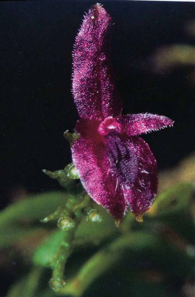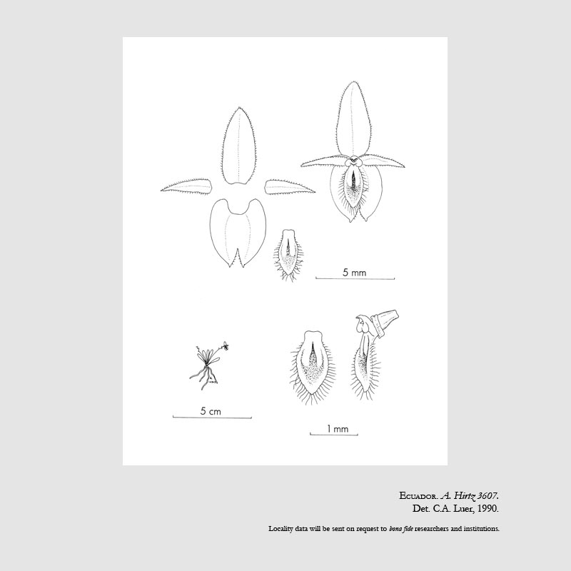 Found in Imbabura Ecuador in wet forests at elevations around 900 meters as a mini-miniature sized, warm growing epiphyte with erect, slender ramicauls enveloped by 1 to 2 thin, tubular sheaths and carrying a single, apical, erect, coriaceous, elliptical, obtuse, cuneate below into the slender petiolate base leaf that blooms in the later fall on a capillary, subcongested, .88" [2.2 cm] long including the .28 to .36" [7 to 9 mm] long peduncle, flexuous, distichous, successively several flowered inflorescence arising from low on the ramicaul.