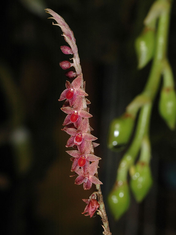 Found in Colombia at elevations of 1600 to 1900 meters as a miniature sized, cool growing epiphyte with erect, slender ramicauls enveloped basally by 2 to 3 thin, ribbed, imbricating sheaths and carrying a single, apical, erecft, coriaceous, elliptical-obovate, subacute, narrows below gradually into the cuneate, petiolate base leaf and blooms in the fall on a strict, congested, to 18" [to 45 cm] long including the 2.4 to 3.2" [6 to 8 cm] long peduncle, successively many flowered inflorescence arising from low on the ramicaul with a bract below the middle and loose, oblique floral bracts.