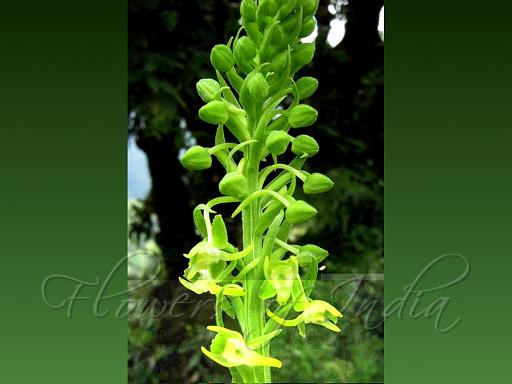 Found in the western Himalayas, Pakistan, the eastern Himalayas and Nepal in scrub on open hillides at elevations of 1200 to 3600 meters as a medium sized, warm to cold growing terrestrial with small, fusiform, ellipsoid to subglobose tubers giving rise to an erect, leafy stem carrying 3 to 4 lower broadly ovate, becoming ovate to oblong-lanceoate up the stem, bract-like above, sessile leaves that blooms in the late spring through summer on an erect, terminal, cylindric, 3.2 to 8" [8 to 20 cm] long, subdensely many flowered inflorescence with lanceolate, acute, shorter than the ovary floral bracts.