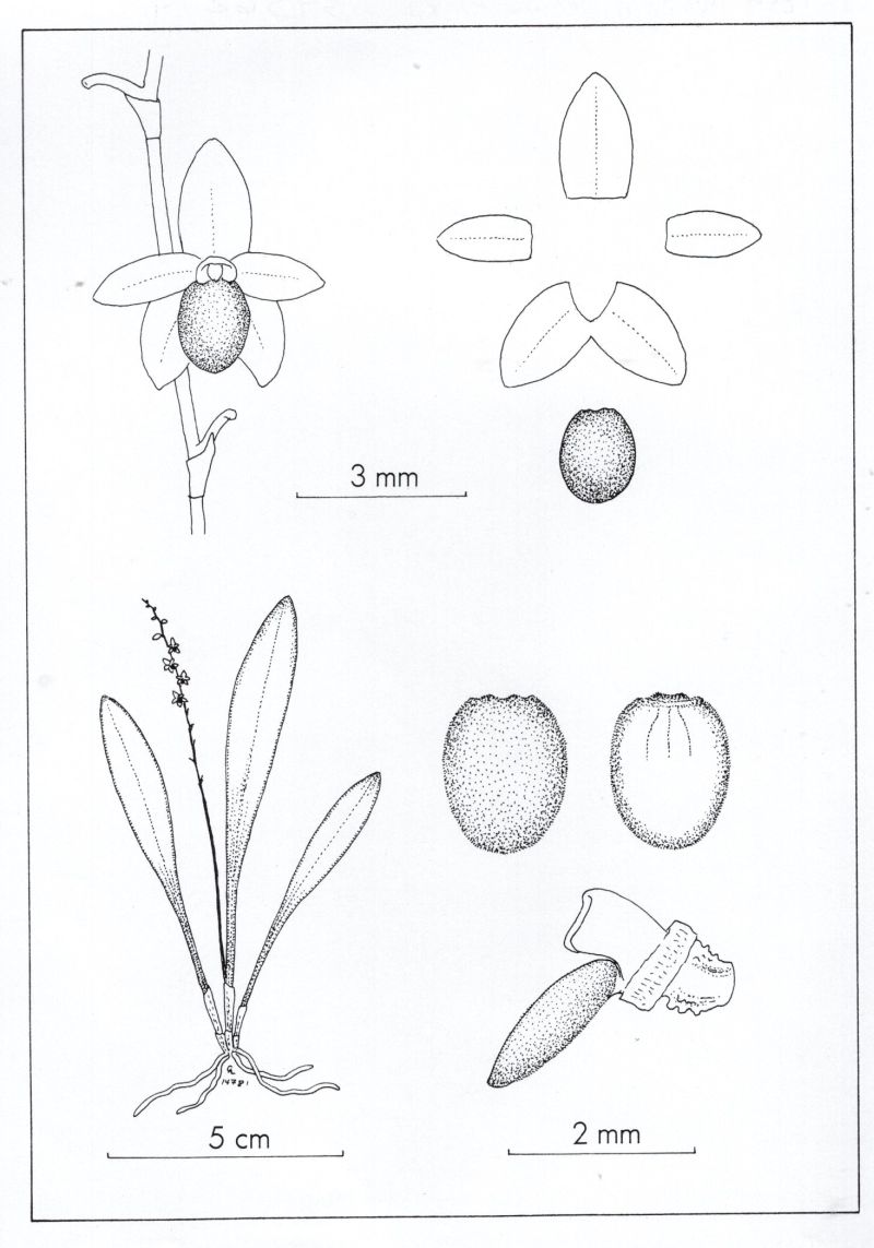 Found in southern Colombia and Ecuador in guava plantations at elevations of 1300 to 1800 meters as a miniature sized, cool growing epiphyte with erect, slender ramicauls enveloped basally by 2 to 3, thin, tubular sheaths and carrying a single, apical, erect, coriaceous, elliptical-obovate, subacute to obtuse, gradually cuneate below in to the petiolate base leaf that blooms in the winter and spring on an erect, subdense, distichous, 2.8 to 3.2" [7 to 8 cm] long including the 1.6 to 2" [4 to 5 cm] long peduncle, successively many flowered inflorescence arising laterally from the ramicaul, with 5 to 10 simultaneously opening flowers at any one time
