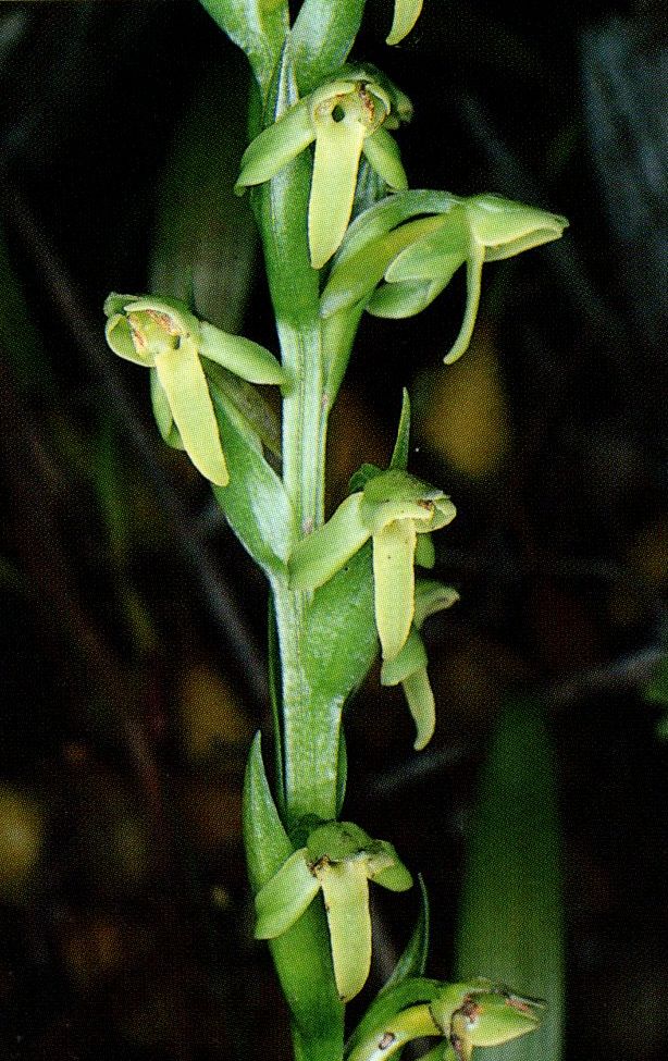 Found in Borneo in upper montane forests at elevations of 1500 to 3400 meters as a small sized, cool to cold growing terrestrial withan erect stem provided with 5 or more leaf sheath bases carrying lanceolate to lanceolate-ovate , more or less adpressed to the stem, sharply acuminate, prominently sulcate mid nerve, above, and carinate beneath, gradually smaller above, basally clasping leave that blooms in the fall on an erect, 4.8" [12 cm] long, lax, to 10 flowered inflorescence with lanceolate, very long acuminate, as long as to longer than the ovary floral bracts