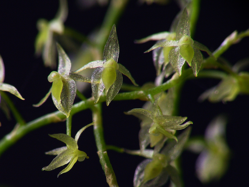 Found in Costa Rica on mossy small branches in wet montane forests at elevations around 100 to 1150 meters as a miniature sized, hot to warm growing epiphyte with erect, slender ramicauls enveloped by 2 to 3 thin, imbricating tubular sheaths and carrying a single, apical, erect, coriaceous, narrowly elliptical-obovate, subacute to obtuse, narrowly cuneate below into the indistinct petiolate base leaf that blooms at any time of the year on an erect, strict, loose, distichous, to 3.2" [to 8 cm] long including the slender .8 to 1.2" [2 to 3 cm] long peduncle, simultaneously several flowered, racemose inflorescence arising laterally from the ramicaul with oblique floral bracts.