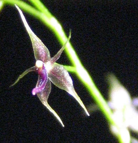 Found in Narino departemnt of Colombia and Pichincha province of Ecuador in wet cloud forests at elevations around 1600 to 2300 meters as a mini-miniature sized, cool to cold growing epiphyte with suberect, slender ramicauls enveloped by 2, thin, imbricating sheaths and carrying a single, apical, erect, coriaceous, elliptical, subacute to obtuse, cuneate below into the petiolate base leaf that blooms in the fall on a filiform, weak, suberect, to 3.6" [9 cm] long including .8 to 1.2" [2 to 3 cm] long peduncle, distichous, flexuous, successively several to many flowered inflorescence arising laterally on the ramicaul and has a thin floral bract.
