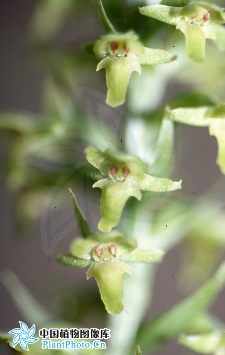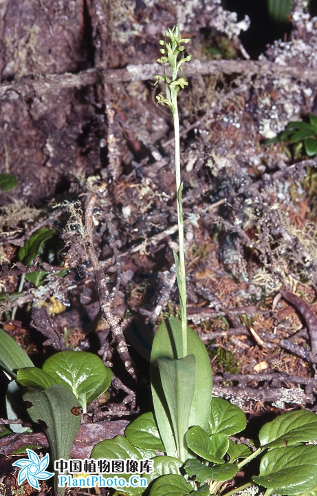 Found in Kazakhstan and Kyrgystan Russia, Gansu, Shaanxi, Sichuan, Xinjiang, Xizang and Yunnan provinces of China in forests on slopes at elevations of 2700 to 4100 meters as a miniature to small sized, cold growing terrestrial with a creeping, cylindric, stoloniferous rootstock giving rise to an erect stem with 1 to 2, basal, tubular sheaths and carrying a single, basal, spathulate to elliptic-spathulate, obtuse to acute, contracted below into the clasping base leaf that blooms in the late spring and early summer on an erect, slender, ridged, 1.2 to 3.2" [3.5 to 8 cm] long, subdensely 4 to 12 floweed inflorescence with 1 to 2 foliaceous, lanceolate bracts and lanceolate, nearly as long as the flowers, acuminate floral bracts.