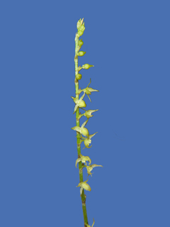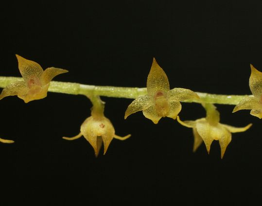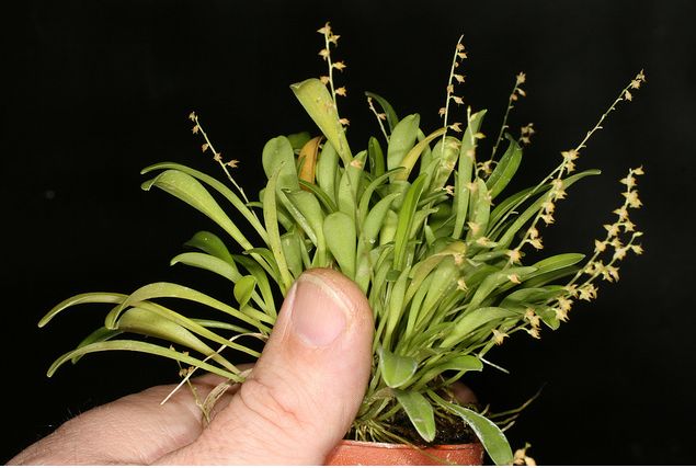 Found in Antioquia department of Colombia at elevations around 2000 meters as a mini-miniature sized, cool to cold growing epiphyte with erect, slender ramicauls enveloped by 2 to 3 thin, immbricating tubular sheaths and carrying a single, apical, erect, coriaceous, narrowly obovate, subacute, narrowly cuneate below into the petiolate base leaf that blooms in the spring on an erect, subdense, distichous, to 3.2" [to 8 cm] long including the 1.2 to 1.6" [3 to 4 cm] long peduncle, simultaneously several to many flowered, racemose inflorescence with tubular floral bracts.