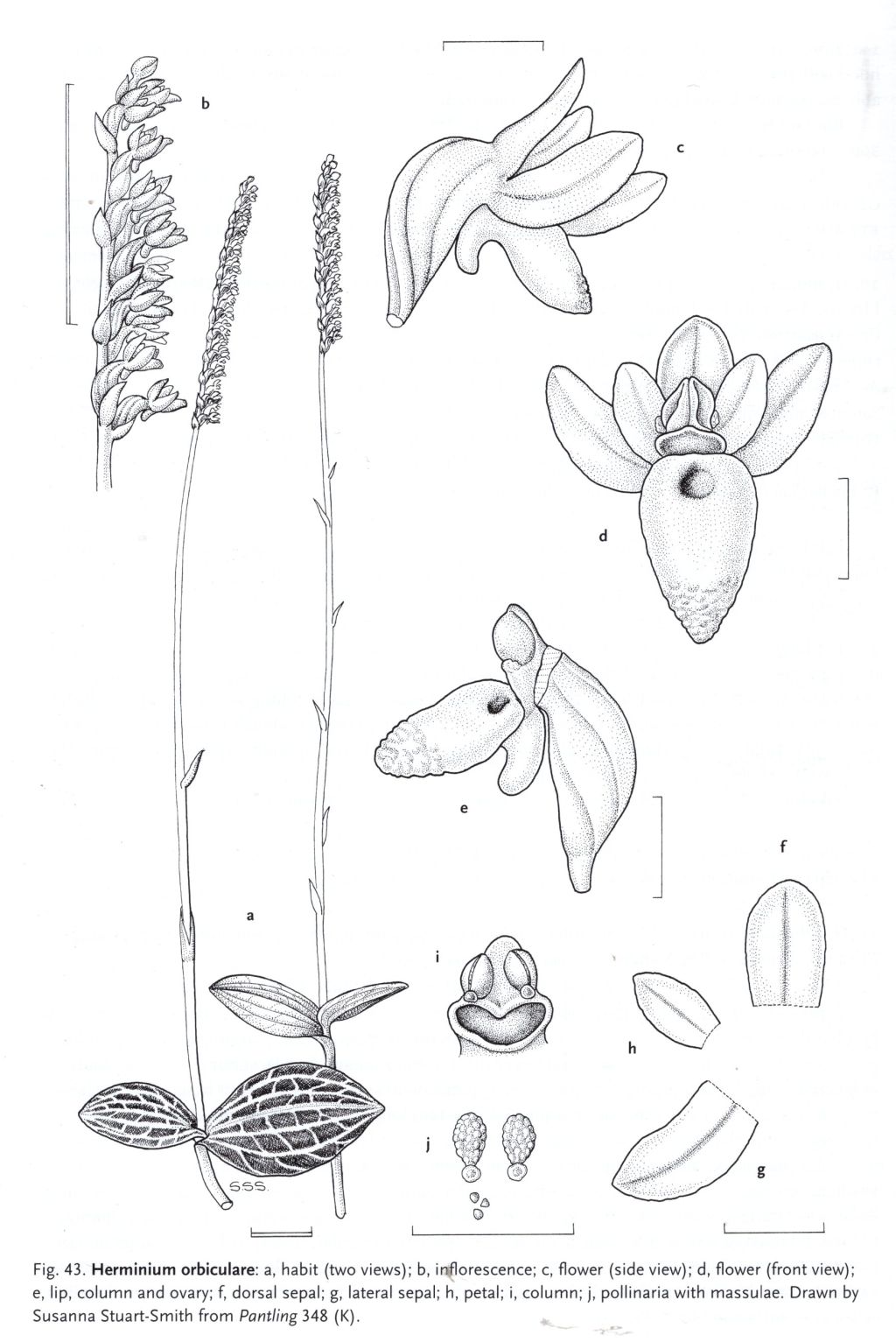 References W3 Tropicos, Kew Monocot list , IPNI ; Icones Vol 22 Hooker 1894 as Herminium orbiculare drawing ok; The Orchids of Sikkim-Himalaya Part 1 King & Pantling 1898 as Herminium orbiculare drawing fide; Indian Orchids: Guide to Identification and Culture Pradhan 1976 drawing fide; Orchids of Bhutan Pearce & Cribb 2002 as Herminum orbicularis drawing fide; Flora of China Vol 25 Orchidaceae Zhengyi, Raven and Duyuan 2009 as Herminium orbicularis; Flora of China Vol 25 Orchidaceae Zhengyi, Raven and Duyuan 2009 as Herminium orbicularis drawing fide