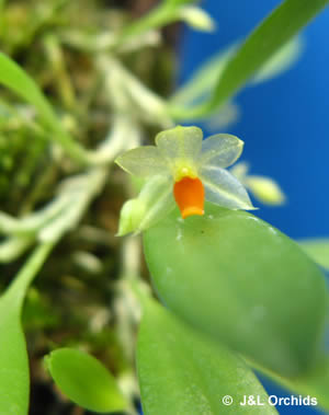 Found in Mexico, Belize and Guatemala in lowland forests at elevations of 300 to 1000 meters as a mini-miniature sized, hot to warm growing epiphyte with suberect, ascending, slender ramicauls enveloped by 2 to 3, thin, tubular sheaths and carrying a single, apical, erect, coriaceous, narrowly elliptic-obovate, subacute to obtuse, gradually narrowing below into the indistinct petiolate base leaf that blooms in the summer and fall on an erect, subdense, .8" [2 cm] long including the .4 to .6" [1 to 1.5 cm] long peduncle, successively few flowered inflorecescence arising laterally from the ramicaul and has a thin floral bract.