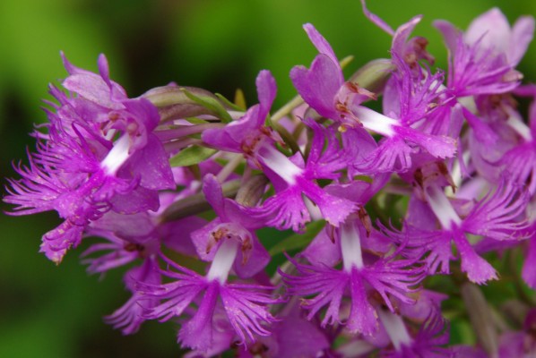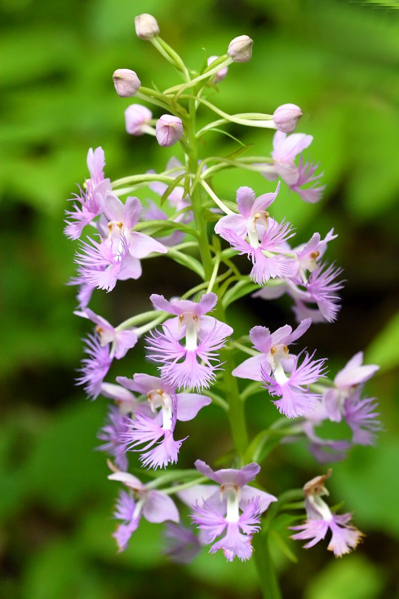 Found in Pennsylvania, West Virginia, Virginia and North Carolina in partial to full shade of damp, open, mixed deciduous and coniferous woods, often along seepage springs or streams, and especially on roadside banks amid mosses, ferns, grasses, sedges, and/or nettles in mountains at elevations of 850 to 1400 meters as a medium to just large sized, cold growing terrestrial that blooms in the mid summer with an extremely long and often ascending inflorescence with highly visible spurs behind each pale frilly flower. This ascending spur orientation is unique to P. shriveri among the purple-fringed orchids.
