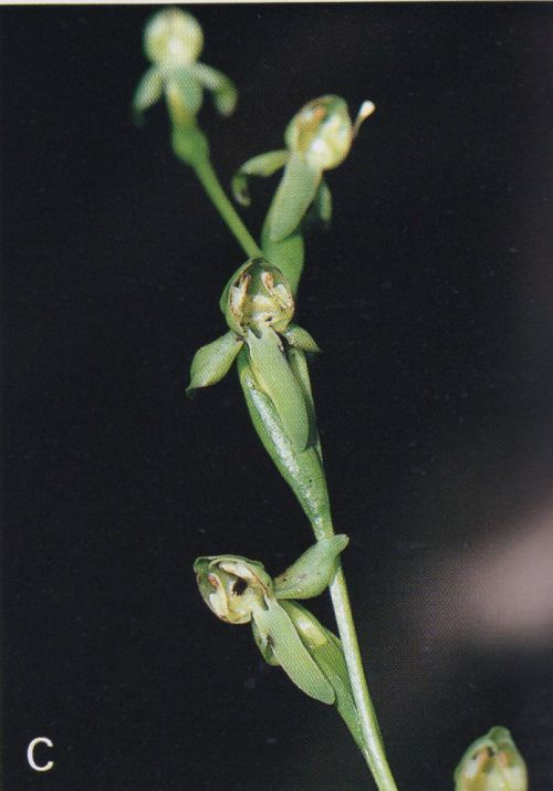 Found only on Mt Kinabalu in Borneo in lower montane forests in damp open areas or between boulders at elevations around 1500 to 2100 meters as a small sized, cool to cold growing terrestrial with an erect, short stem carrying 2, unequal, elliptic-lanceolate, acute petiolate base leaves that blooms on an erect, lateral, peduncel to 26 cm] long, provided with a 11 or so, tubular, acuminate sheaths, rachis 4.8" [12 cm] long, simultaneously 9 or so flowered inflorescence.