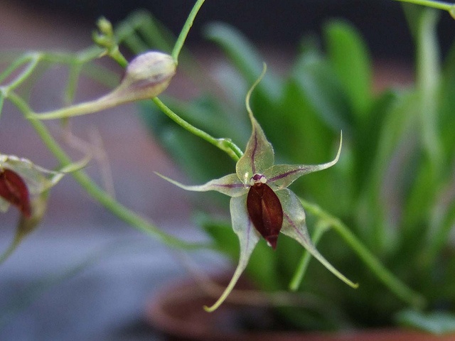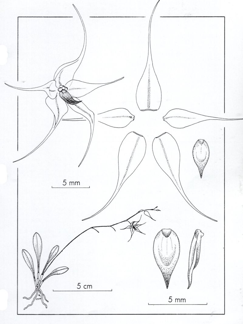 Found in Pichincha province of Ecuador at elevations around 2400 meters as mini-miniature sized, cold growing epiphyte with an erect, slender ramicaul enveloped by 2 to 3, thin, ribbed, imbricate sheaths and carrying a single, apical, erect, coriaceous, narrowly elliptical-obovate, subacute, narrowly cuneate below into the petiolate base leaf that blooms in the summer and fall on a suberect,weak, filiform, 6” [15 cm] long including the 1.6 to 2" [4 to 5 cm] long peduncle, distantly and successively few flowered inflorescence arising laterally from the ramicaul with thin floral bracts.