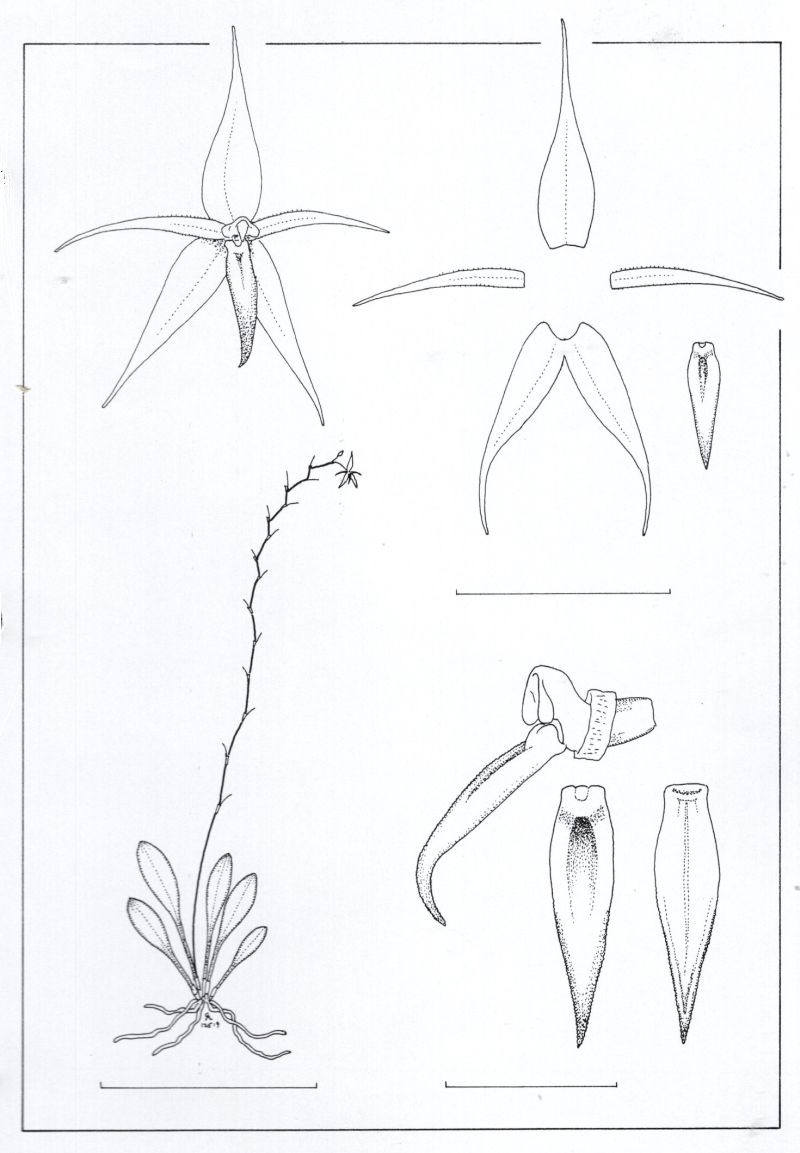 Found in Colombia, Ecuador and Bolivia at elevations around 1500 to 3600 meters as a mini-miniature sized, cool to cold growing epiphyte with erect, slender ramicauls enveloped by 2 to 3 thin, tubular sheaths and carrying a single, apical, erect, coriaceous, elliptical, subacute to obtuse, cuneate below into the slender petiolate base leaf that blooms in the winter on a weak, loose, distichous, to 6" [to 15 cm] long including the 1.2" [3 cm] long, capillary peduncle, successively many flowered, racemose inflorescence.