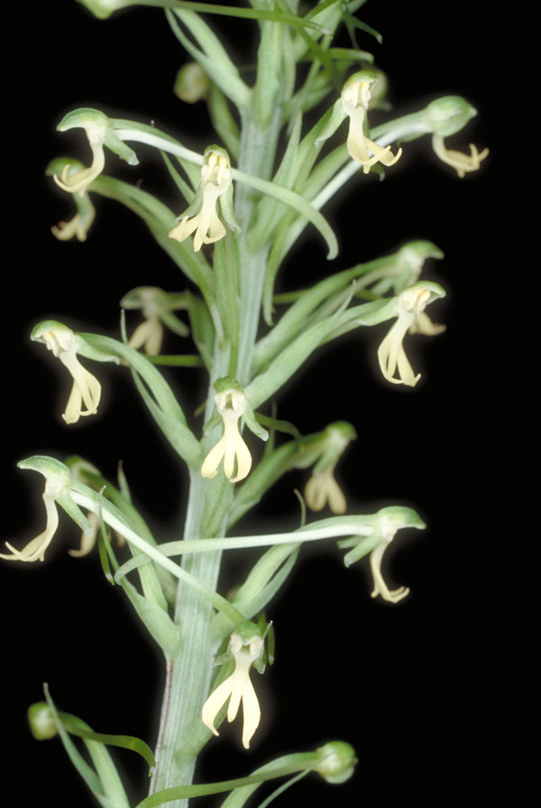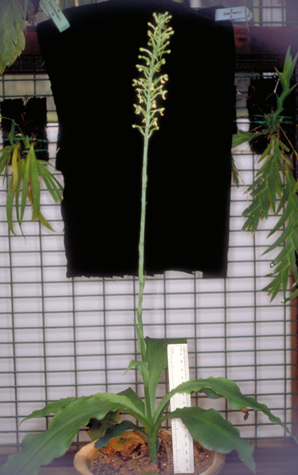 Found in Java on the forest floor at elevations of 500 to 1000 meters as a medium to large sized, hot to warm growing terrestrial with 4 to 6 basal, acuminate, darker green veined leaves that blooms in the fall and early winter on an erect, terminal, 20" [50 cm] long, 30 to 40 flowered inflorescence with lanceolate, concave, pale green, longer than the flowers floral bracts and carrying the flowers held well away from the rachis