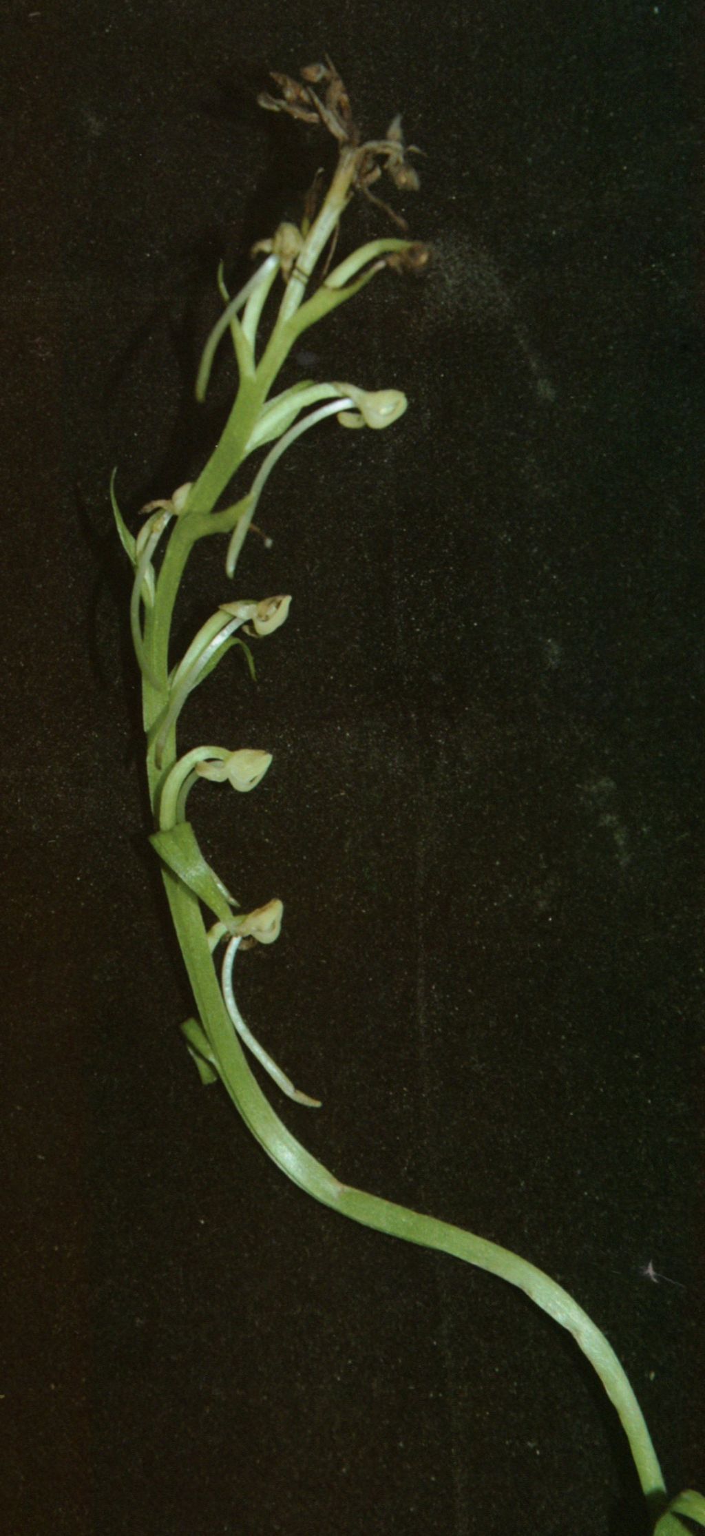 Found in Anhui province of China in marshlands at elevations of 1400 meters as a cool growing terrestrial with a narrowly ellipsoid tuber giving rise to an erect stem carrying 1 to 2, basal, oblong, acute, bract-like leaves that blooms in the summer on an erect, 8 to 9 flowered inflorescence with lanceolate, longer than the ovary floral bracts and carrying secund flowers