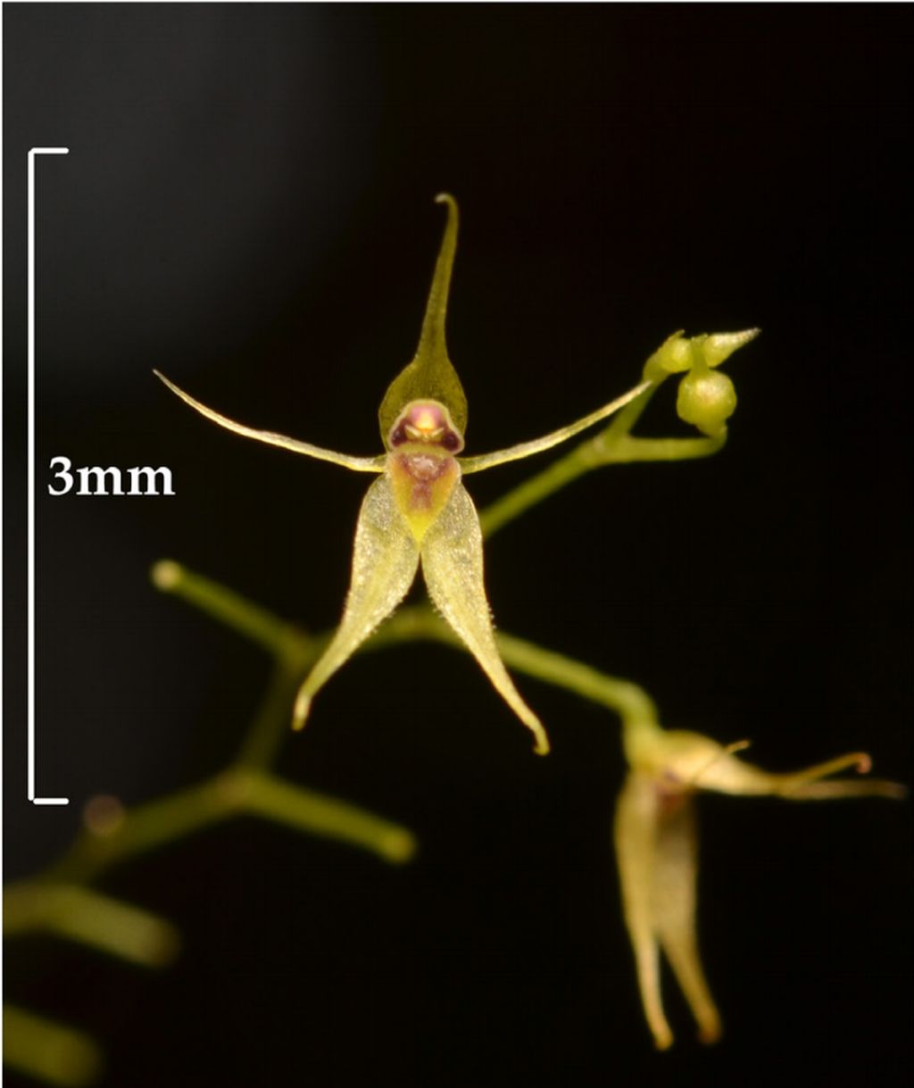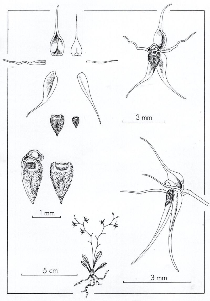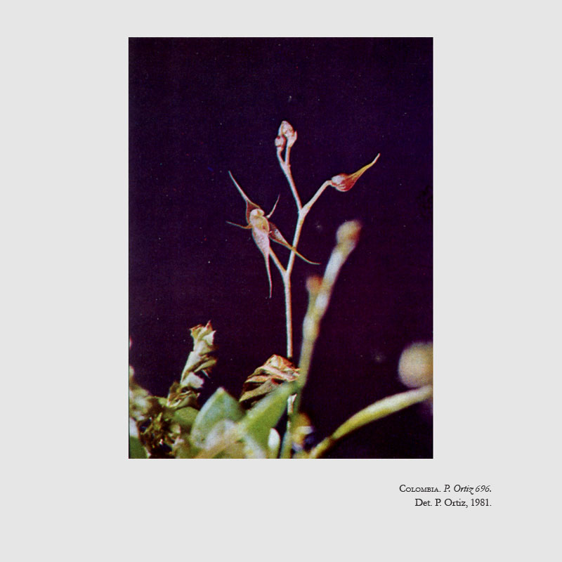 Found in Colombia and Ecuador in cloud forests at elevations around 1100 to 2500 meters as a miniature to small sized, cool to cold growing epiphyte with slender ramicauls enveloped by 2 to 3, thin, ribbed, imbricating sheaths and carrying an erect, coriaceous, narrowly elliptical-obovate, subacute, narrowing cuneate below into the petiolate base leaf that blooms in the spring and summer on an erect, slender, .4 to .8" [1 to 2 cm] long including the .4 to .8" [1 to 2 cm] long peduncle, loose, flexuous, disitchous, successively several to many flowered, racemose inflorescence arising laterally from the ramiucal with thin floral bracts.