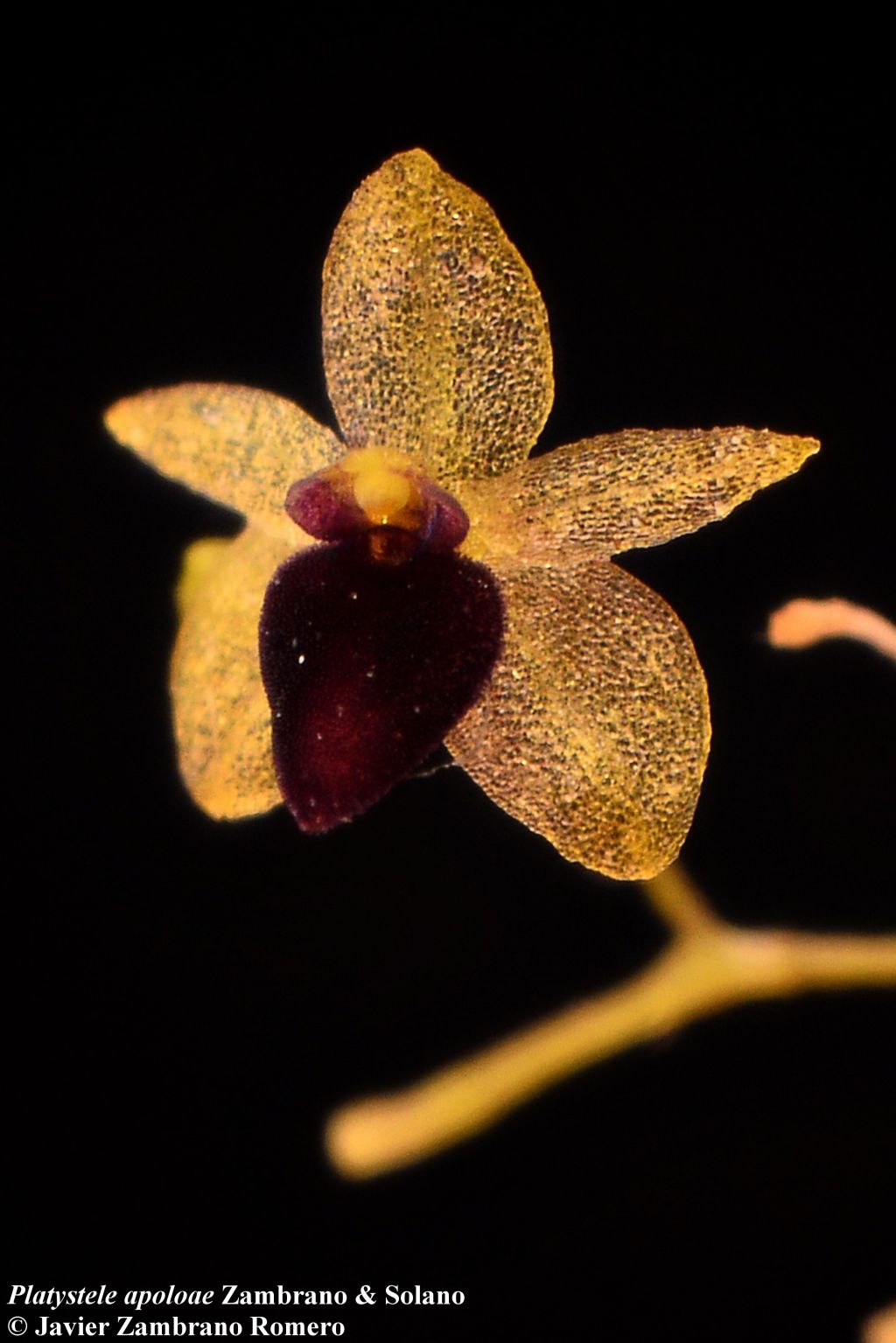 "The most similar species with the new taxon is the Ecuadorian Platystele cornejoi which can be distinguished from P. apoloae by its shorter inflorescence (less 1.6" vs up to 4" [4.0 cm vs. up to 10 cm]), shorter pedicels (.4 to .6" vs .6 to 1.2" [1.0–1.5 mm vs. 1.5–3.0 mm]), smaller sepals with an obtuse apex (.4 vs .52 to .68" [1.0 mm vs. 1.3–1.7 mm], acute), smaller, not oblique, acute, marginally entire petals (.32 vs .48 to .64" [0.8 mm vs. 1.2–1.6 mm], oblique, acuminate, marginally erose), yellow or yellow and red stained lip provided with a triangular callus (vs. purple, with a rounded callus), yellow-green and concolor column (vs. light yellow with purple on the stigmatic lobes)." Zambrano, Cornejo & Solano 2018