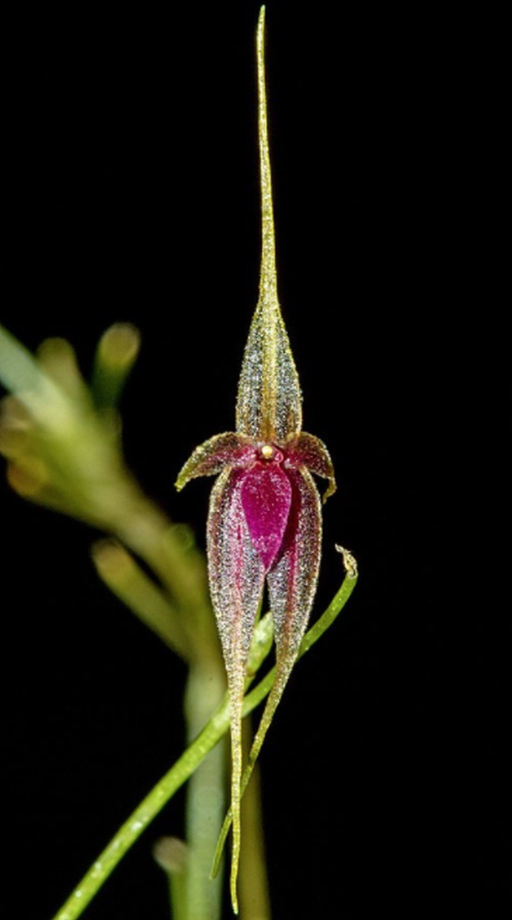 "The new species is similar to P. caudatisepala, which occurs from Mexico to Ecuador at similar elevations; the discoverer Luis Baquero reports that P. caudatisepala is present in the same area as P. baqueroi. As in P. caudatisepala, the dorsal sepal varies greatly in length from flower to flower, and the margins of the floral parts have conspicuous clavate cilia. The most obvious difference between P. baqueroi and P. caudatisepala is that the former’s lateral sepals are connate for .08" [2 mm] while the latter’s sepals are free to the base. The petals of P. baqueroi are usually strongly reflexed, as are the outer margins of the sepals. The lip is thick in the middle, thin at the edges, and the upper (adaxial) surface is strongly convex, unlike the planar lip of P. caudatisepala. The leaves of P. baqueroi are petiolate versus subpetiolate in P. caudatisepala. Another similar Platystele with long sepaline tails is P. posadarum Luer & Escobar from Colombia (Luer 1990). Platystele baqueroi differ from P. posadarum in having lateral sepals connate for .08" [2 mm] versus free to near the base in P. posadarum, smaller more narrow petals than P. posadarum .16 x .028" [4 mm × 0.7 mm] versus .24 x .92" [6 mm × 2.3 mm], front surface of the lip featureless versus sulcate in P. posadarum, and tip of lip apiculate and deflexed versus obtuse in P. posadarum. Platystele speckmaieri Luer & Sijm is also superficially similar with its long-attenuate sepals. However, its sepals are free and spreading, its petals are also spreading, the lip is sulcate, contracted above the middle, narrowly obtuse at apex , and the peduncle of the inflorescence is up to 2.4" [60 mm] long versus .2" [5mm] in P. baqueroi." Baquero & Zuchan 2017