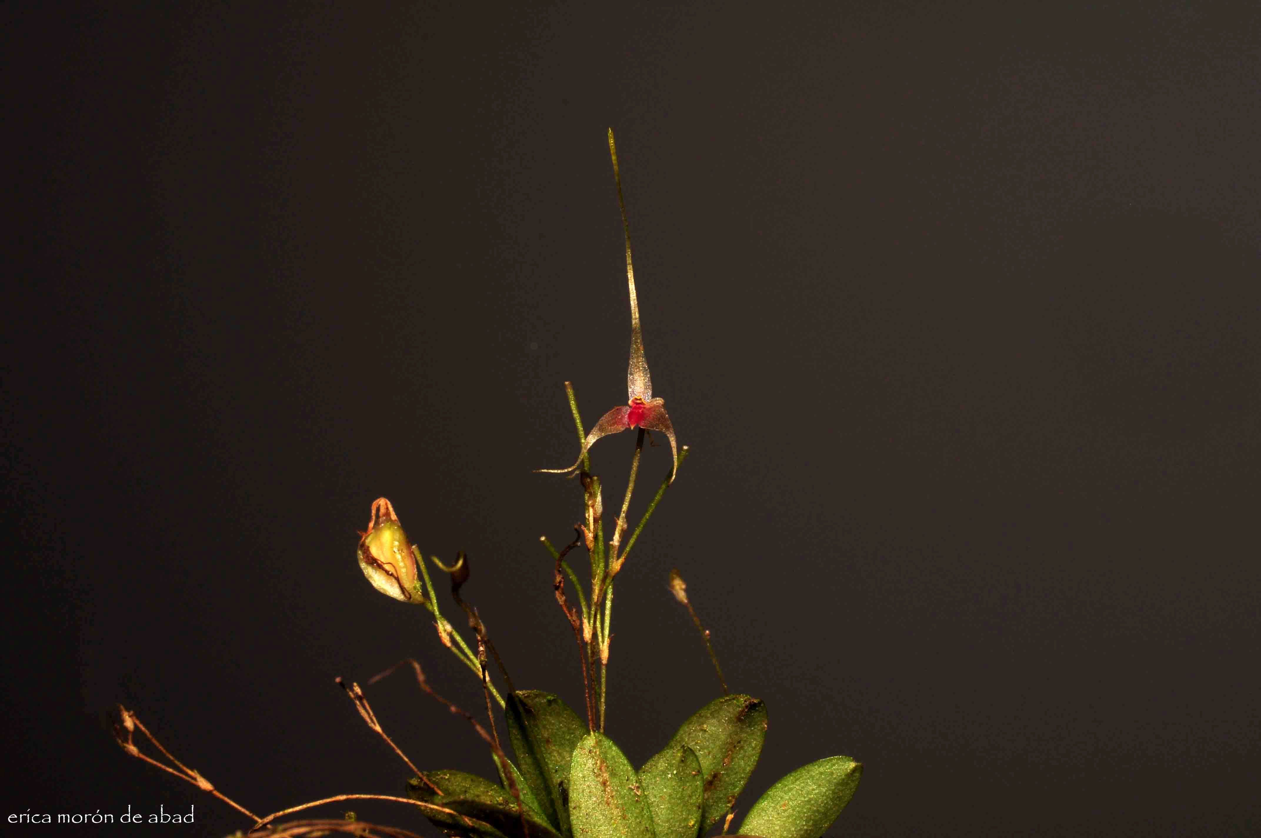 Found in Chiapas state of Mexico, Guatemala, Costa Rica, Panama, Ecuador and Peru in extremely wet montane cloud forests at elevations around 400 to 1100 meters as a mini-miniature sized, hot to cool growing epiphyte with slender ramicauls enveloped by 2 to 3, thin, ribbed, imbricating sheaths and carrying a single apical, erect, coriaceous, elliptic, subacute, gradually narrowing below into the cuneate, subpetiolate base leaf that blooms in the later summer through early winter on a congested, to .72 to 1.32" [1.8 to 3.3 cm] long including the .4 to 1" [1 to 2.5 cm] long peduncle, successively single [6] flowered inflorescence arising from low on the ramicaul