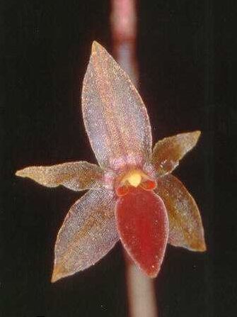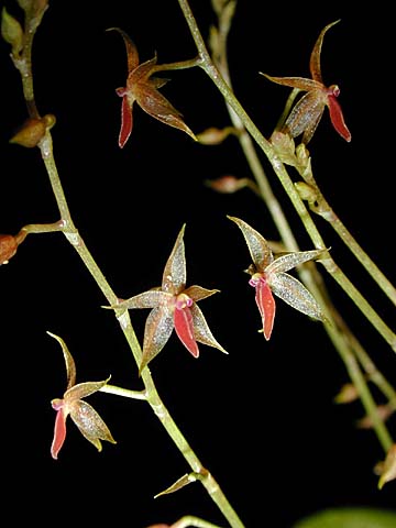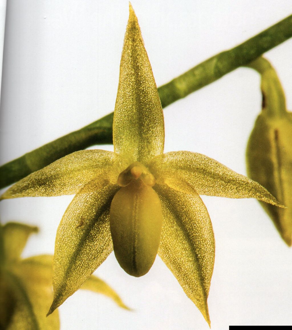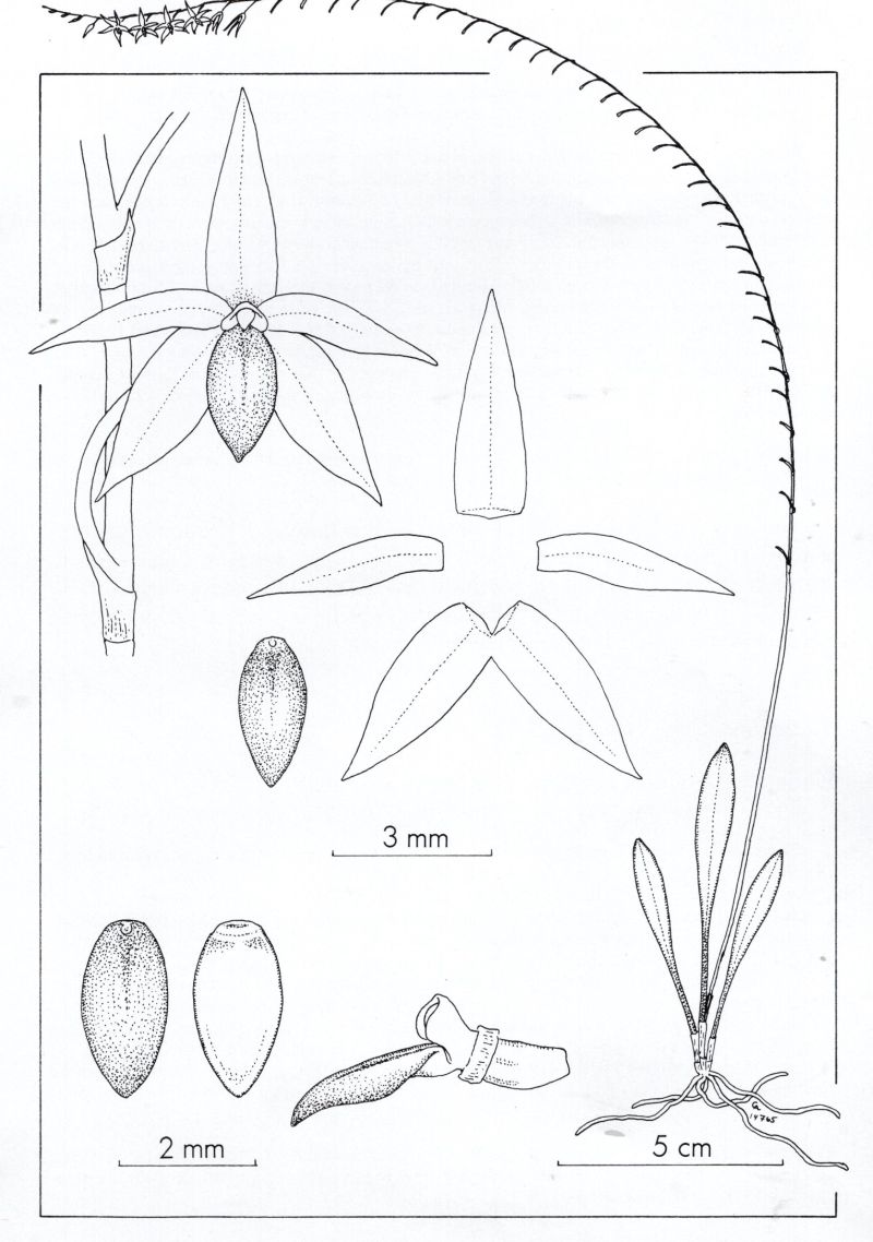 Found in Colombia in wet and humid premontane and montane forests at elevations of 1600 to 2500 meters as a mini-miniature sized, cool to cold growing, epiphyte with an erect, slender ramicaul enveloped by 2 to 3 thin, tubular sheaths with a single, apical, erect, coriaceous, elliptic, acute leaf that is cuneate towards the base and gives rise to an erect, subdense, 20" [50 cm] long including the 2 to 6" [5 to 15 cm] long peduncle, successively many flowered, elongating with time, racemose inflorescence with several of the many flowers produced simultaneously and all crowded into the apical portion.