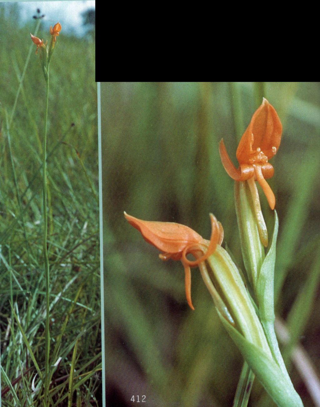 Found in Senegal, Guinea-Bissau, Mali, Guinea, Sierra Leone, Burkino Faso, Ivory Coast, Ghana, Benin, Nigeria, Chad, Cameroon, Central African Republic, Gabon and Congo in marshes or damp grassy places in meadows as a small sized terrestrial with a single ellipsoid tuber giving rise to an erect, delicate, glabrous stem carrying 5 to 6, spaced out along the stem, narrowly lanceolate, acute, suberect, decreasing in size towards the apex, the uppermost bract-like leaves that blooms in the later spring through fall on an eret, terminal, .8 to 1.4" [2 to 3.5 cm] long, 1 to 3 flowered inflorescence with broadly ovate-lanceolate, acuminate floral bracts and carrying yellow-orange to orange flowers .