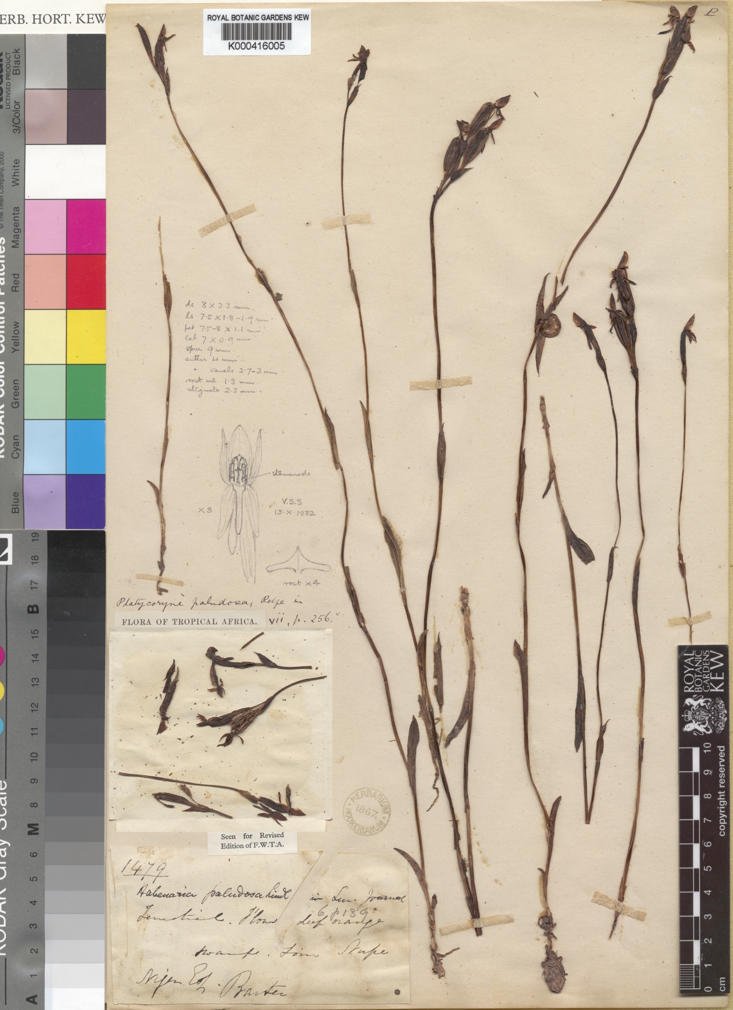 Synonyms Habenaria aurea Kraenzl. 1893; *Habenaria paludosa Lindl. 1862; Habenaria wilfordii Ridl. 1886; Platycoryne aurea (Kraenzl.) Rolfe 1898; Platycoryne wilfordii (Ridl.) Rolfe 1898