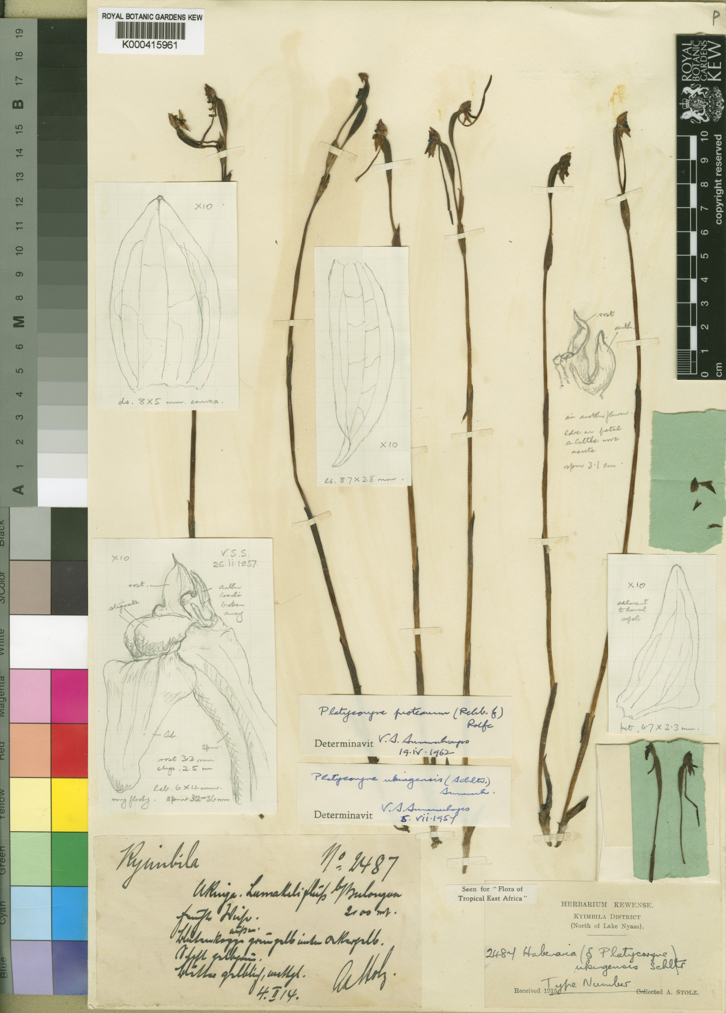 Synonyms Habenaria paludosa Rchb.f. 1865; *Habenaria protearum Rchb.f. 1878; Habenaria ukingensis Schltr. 1915; Platycoryne protearum var. recurvirostrum G.Will. 1980; Platycoryne ukingensis (Schltr.) Summerh. 1958