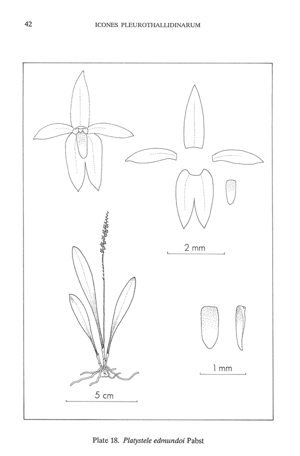 References W3 Tropicos, Kew Monocot list , IPNI ; Orchidaceae Brasilienses Vol 1 Pabst & Dungs 1975 drawing good; Icones Pleurothallidinarum Vol VII Systematics of Platystele Luer 1990 drawing fide;