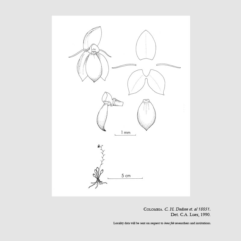 Found in Narinodepartment of Colombia in wet forests without locational data as a mini-miniature sized epiphyte with erect, slender ramicauls enveloped by 2 to 3, thin, ribbed, imbricating sheaths and carrying a single, apical, erect, coriaceous, elliptical-obovate, subacute, narrowly cuneate below into the slender petiolate base leaf that blooms in the summer on a filiform, erect, weak, to 2.4" [6 cm] long including the .8 to 1" [2 to 2.5 cm] long peduncle, distichous, distantly and successively several flowered inflorescence arising laterally on the ramicaul and has a thin floral bract.