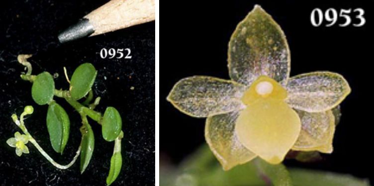 Found in Guatemala at elevations around 600 to 1000 meters as a mini-miniature sized, warm, repent growing terrestrial with short ramicauls enveloped by white, papery, tubular, acute sheaths and carrying an eplliptic to sub-orbicular, concave, rounded apically leaf that blooms in the later spring on an erect, short, .56" [1.4 cm] long, alternate, several flowered inflorescnece with globose, shorter than the ovary floral bracts and carrying transparent yellow flowers with an opaque yellow lip.