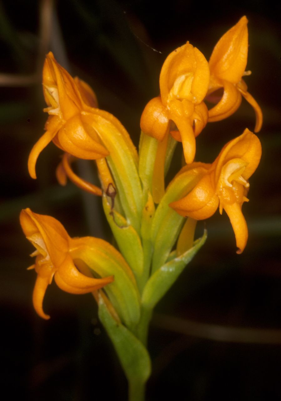 Found in Burundi, Zaire, Tanzania, Malawi, Zambia and Zimbabwe at elevations of 200 to 1600 meters in damp grasslands and Brachystegia forests as a small to medium sized, warm growing growing terrestrial orchid with ellipsoid to almost globose, sparsely tomentose tubers giving rise to an erect, somewhat flexuous, slender, leafy throughout, terete stem carrying 6 to 10, the lowermost 1 to 2, reduced to sheaths, the rest suberect to spreading, small towards apex leaves that blooms in the late spring and early summer on a short, to 2" [5 cm] long, densely 2 to 7 flowered inflorescence with broadly lanceolate, acuminate, shorter than the ovary floral bracts.