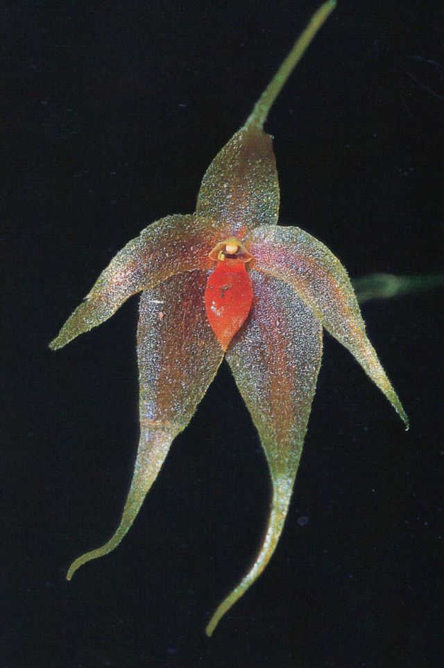 Found in Antioquia department of Colombia and Ecuador in cloud forests at elevations around 1600 meters as a mini-miniature sized, cool growing epiphyte with erect ramicauls enveloped by 2 thin, imbricating sheaths and carrying a single, apical erect, coriaceous, elliptical, obtuse to rounded, cuneate below into the petiolate base leaf that blooms in the fall on a suberect, to 1.6" [4 cm] long including the .4" [1 cm] long peduncle, filiform, loose, successively few flowered, racemose inflorescence arising from low on the the ramicaul and has thin floral bracts.