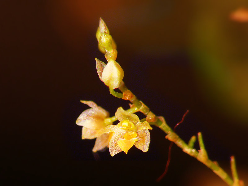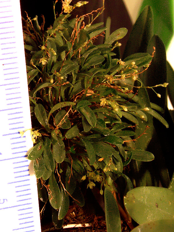 Found in Costa Rica and Panama at elevations of 1400 to 2000 meters as a miniature sized, cool growing epiphyte with erect, slender ramicauls enveloped basally by 2 to 3 thin, ribbed, imbricating sheaths and carrying a single, apical, erect, coriaceous, narrowly-elliptical-obovate, subacute, narrowly cuneate into the petiolate base leaf that blooms in the winter and early spring on a erect, slender, .8" [2 cm] long including the .4" [1 cm] long peduncle, distichous, flexuous, subdense, successively several to many flowered, racemose inflorescence with only 1 to 2 flowers open at any one time arising from low on the ramicaul, and has thin floral bracts.